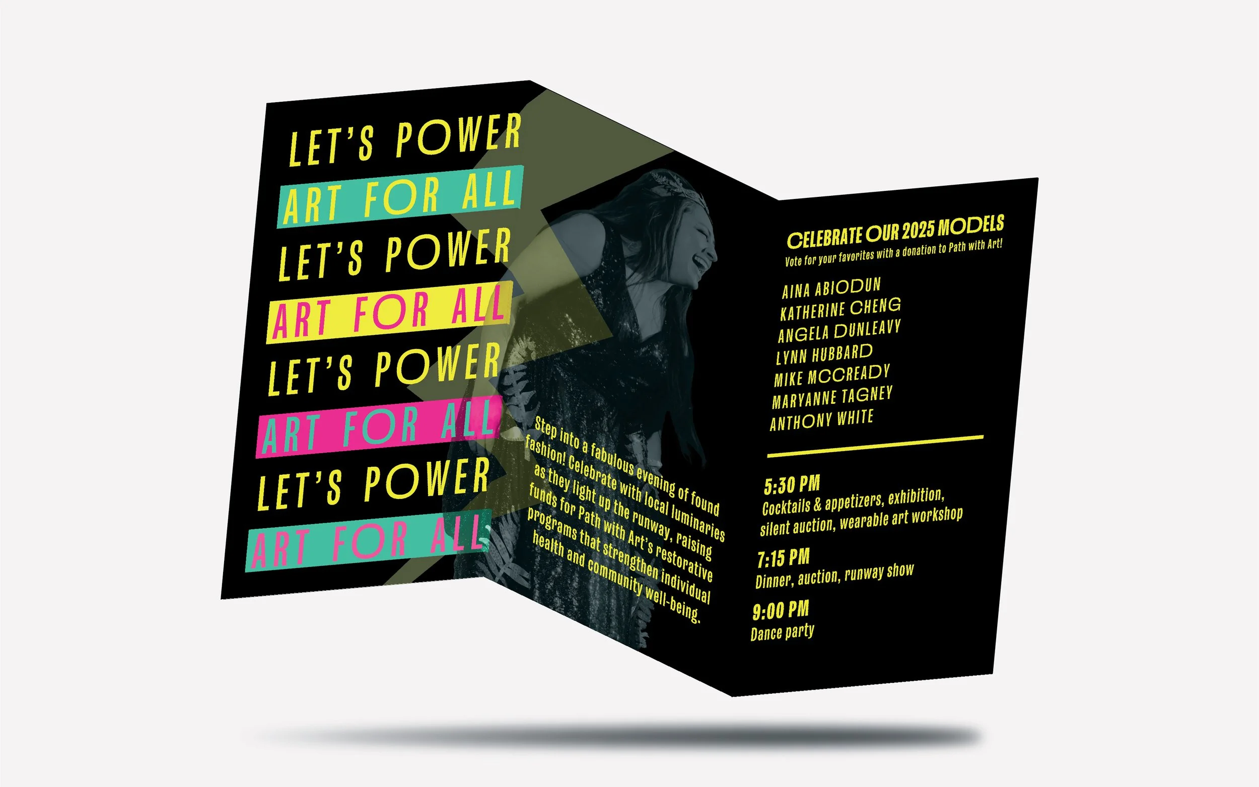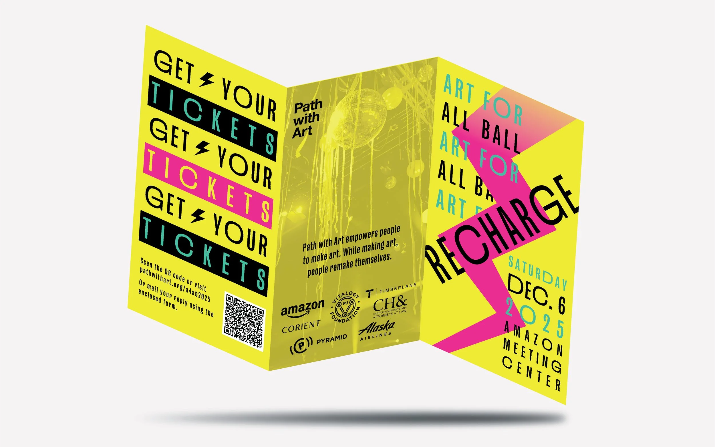 As the design lead on this project, I collaborated with Path with Art’s Marketing Director to devise this year’s brand identity. We landed on a pop-art-inspired aesthetic, choosing a lightning bolt as the graphic anchor for the suite of design assets supporting the Ball. This tri-fold print invitation, which hit thousands of mailboxes in the Seattle area and beyond, shared the excitement and energy around this once-a-year opportunity to support Path with Art’s invaluable mission.